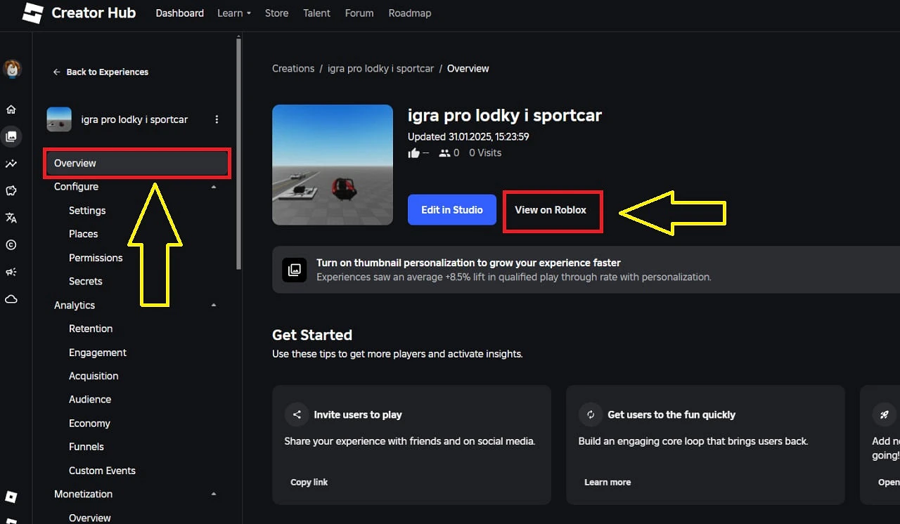 - Здесь же, в разделе Overview. Вы можете посмотреть вашу игру на площадке Roblox и скопировать ссылку для друга, если не получается найти через поисковик.