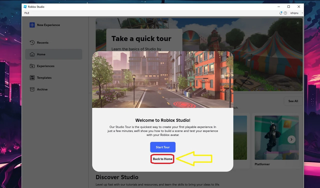 - В появившемся окне жмем Continue. Отлично, мы оказались на главной странице программы. Она предлагает нам ознакомительный тур. Если у вас есть некоторые знания английского, то нажмите Start Tour. Вас перебросит на площадку, где предложат немножко изменить имеющуюся локацию. Чтобы закрыть обучение нажмите «Закрыть вкладку». Далее — No. После — Back to Home.