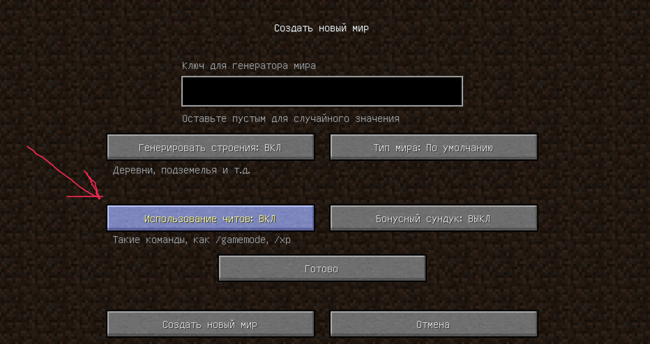 - При создании мира, в дополнительных настройках, активируем возможность пользоваться читами.
