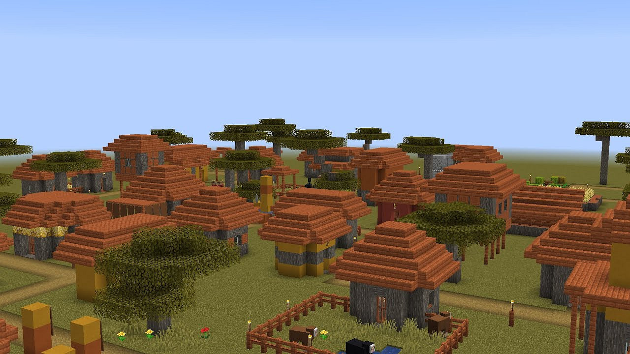 - Саванны. В этих биомах деревни отличаются зданиями с плоскими верхушками крыш и оранжевыми стенами.