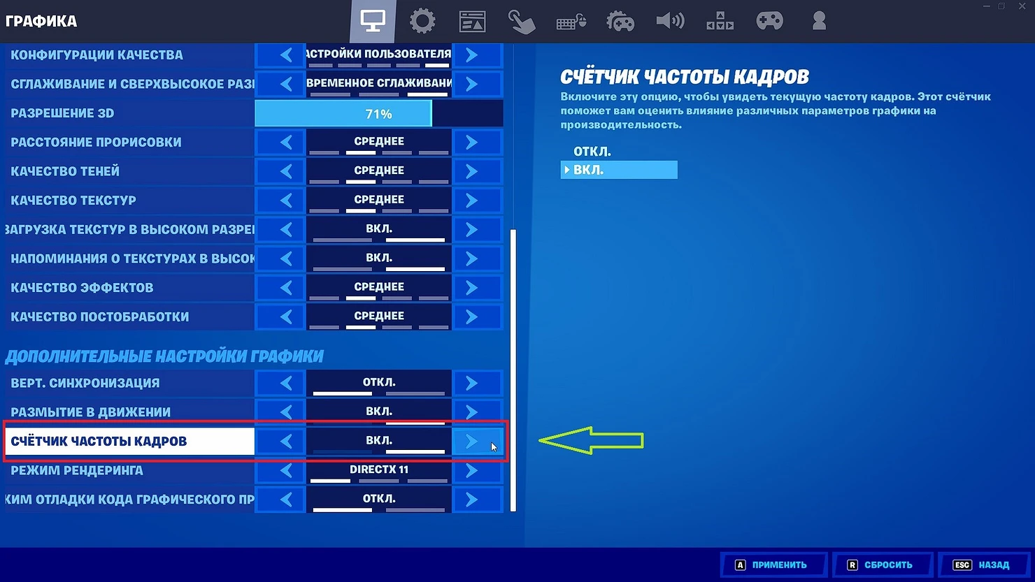 Разработчики встроили собственный счетчик, поэтому скачивать ничего не придется. Переходим в «Параметры», раздел «Графика» и находим пункт «Счетчик частоты кадров» — устанавливаем в положение «Вкл».