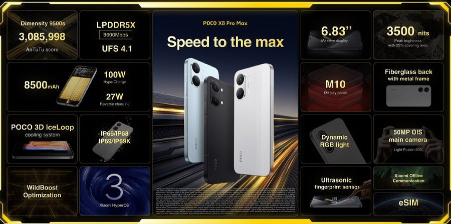 Внутри Poco X8 Pro Max установлен 3-нм чип MediaTek Dimensity 9500s с памятью LPDDR5X и накопителем UFS 4.1. Младшая версия работает на MediaTek Dimensity 8500 Ultra. Обе модели оснащены системой охлаждения Poco 3D Ice Loop, при этом у Max увеличенная площадь рассеивания тепла — это важно для стабильной производительности в играх.