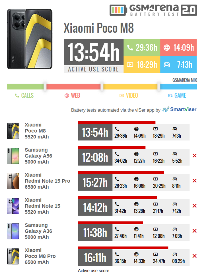 В тесте, который имитирует усредненный режим использования, POCO M8 5G продержался 13 часов и 54 минуты. Это хороший результат, но не выдающийся.