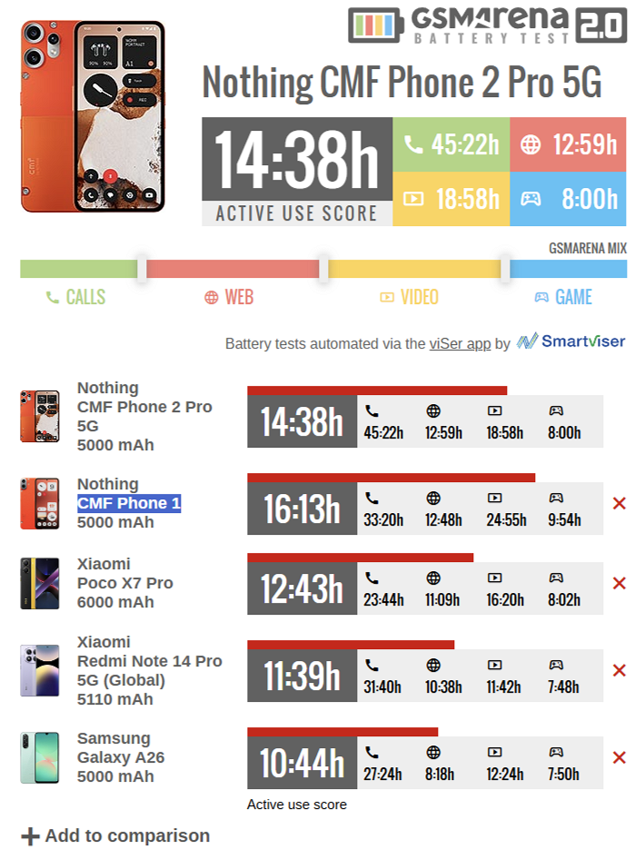 Что касается POCO X7 Pro, REDMI Note 14 Pro 5G (глобальная версия) и Samsung Gaalaxy A26, то все они уступают CMF Phone 2 Pro 5G по автономности. Результаты у них 12 часов 43 минуты, 11 часов 39 минут и 10 часов 44 минуты соответственно.