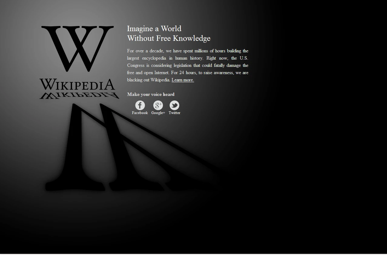 «За более, чем десять лет, мы потратили миллионы часов, создавая крупнейшую энциклопедию в истории человечества. Прямо сейчас, Конгресс США рассматривает закон, который может полностью уничтожить свободный и открытый Интернет. На 24 часа, чтобы повысить информированность [пользователей], мы отключаем Wikipedia» — значится на главной странице английской «Вики», которая выглядит сегодня весьма лаконично. Кроме того, там расположена ссылка, ведущая на страницу о SOPA (можно перейти к статье о PIPA). При попытке открыть в энциклопедии любую на английском статью о других явлениях, пользователь автоматически перейдет на главную страницу с указанным выше текстом. Статьи на других языках доступны.