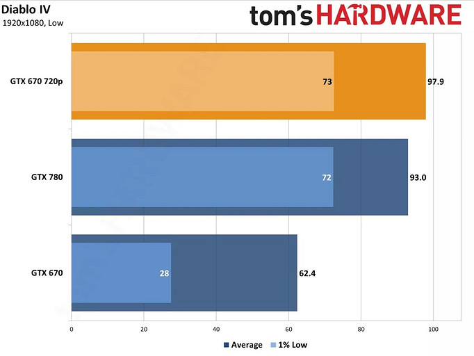 Так, эксперты Tom's Hardware проверили игру с видеокартами разных поколений. И были приятно удивлены узнать, что даже древние GeForce GTX 670 и GTX 780 выдают в Diablo IV около 60 fps при самых низких настройках графики. При ультра-настройках GTX 780 позволяет играть при 47 fps.