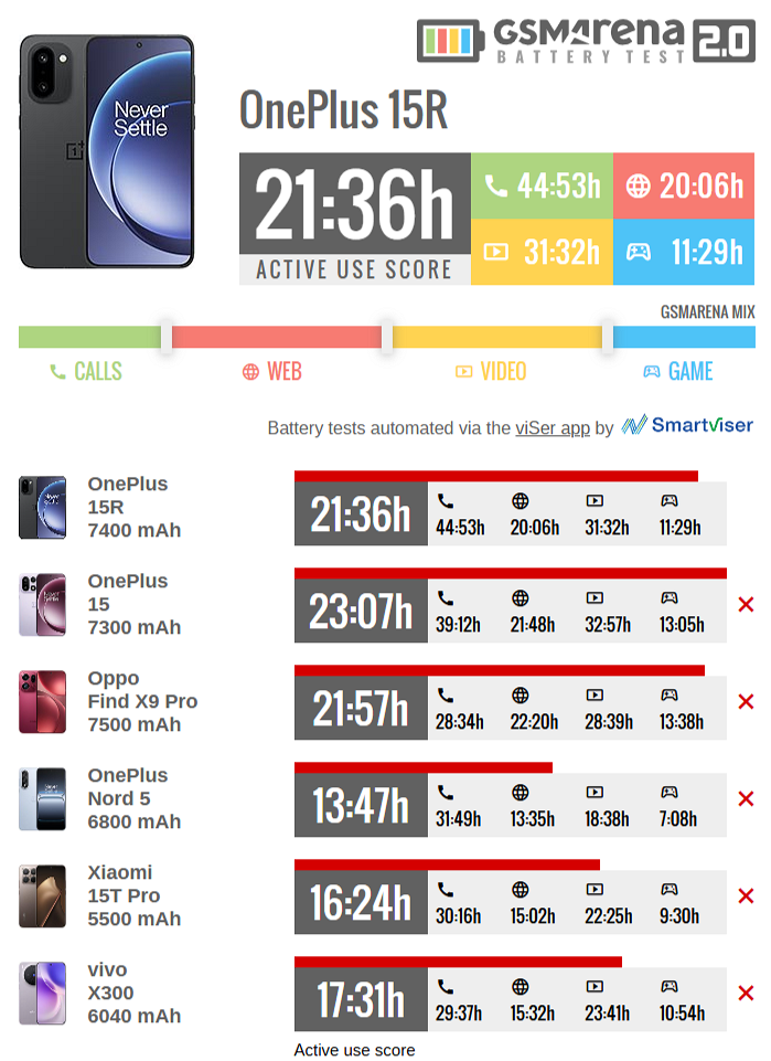 В тесте, который имитирует усредненный режим использования, OnePlus 15R продемонстрировал результат в 21 час и 36 минут. Большинство конкурентов позади. Так, у OnePlus Nord 5 автономность на уровне 13 часов и 47 минут. Xiaomi 15T Pro выдержал 16 часов и 24 минуты. У vivo X300 получилось 17 часов и 31 минута. А вот OnePlus 15, несмотря на меньшую батарею, работает дольше, 23 часа и 7 минут. У OPPO Find X9 Pro автономность на уровне 21 часа и 57 минут.