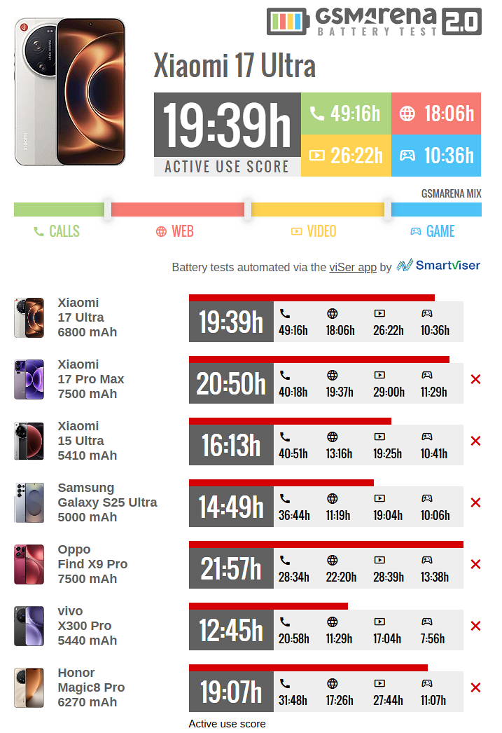 У остальных флагманов результаты хуже, чем у Xiaomi 17 Ultra. Так, Xiaomi 15 Ultra (5410 мА*ч) выдержал 16 часов и 13 минут. Samsung Galaxy S25 Ultra (5000 мА*ч) проработал 14 часов и 49 минут. vivo X300 Pro (5440 мА*ч) показал 12 часов и 45 минут. У HONOR Magic8 Pro (6270 мА*ч) 19 часов и 7 минут.