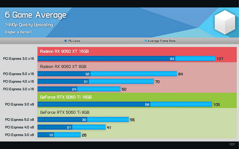 - Radeon RX 9060 XT 16 ГБ с подключением по интерфейсу PCIe 3.0 — 107 fps.
