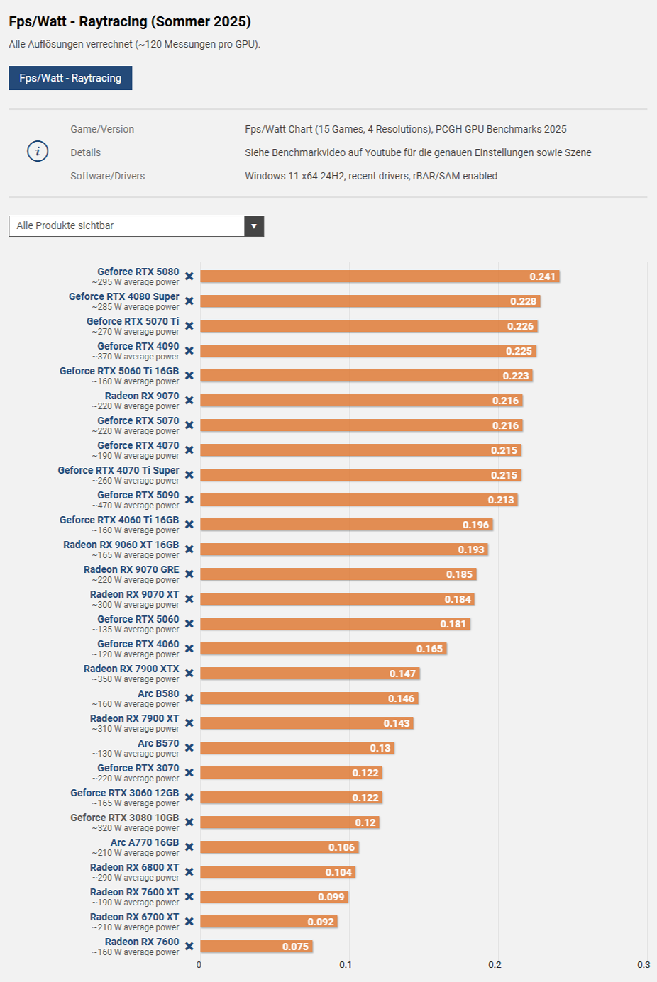 А если включить трассировку лучей? В лидеры в этом случае вырывается GeForce RTX 5080 с 0,241 fps на 1 Вт. Следом идут GeForce RTX 4080 SUPER и GeForce RTX 5070 Ti.