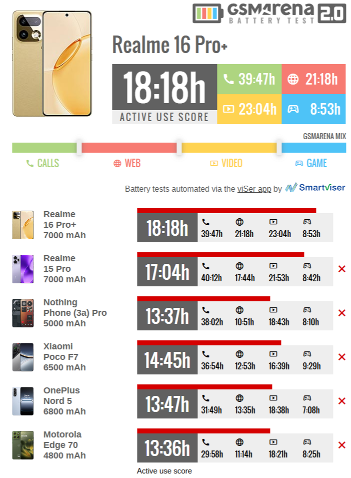 В тесте, который имитирует усредненный режим использования, realme 16 Pro+ показал результат в 18 часов и 18 минут. Это более чем на час больше в сравнении с realme 16 Pro, у которого автономность в 17 часов и 4 минуты.