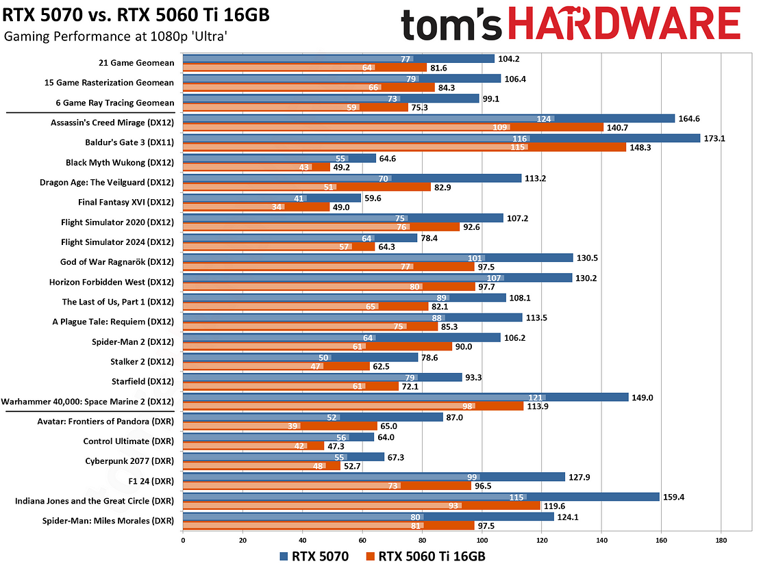 Эксперты сравнили видеокарты GeForce RTX 5070 и GeForce RTX 5060 Ti на 16 ГБ в 21 игре