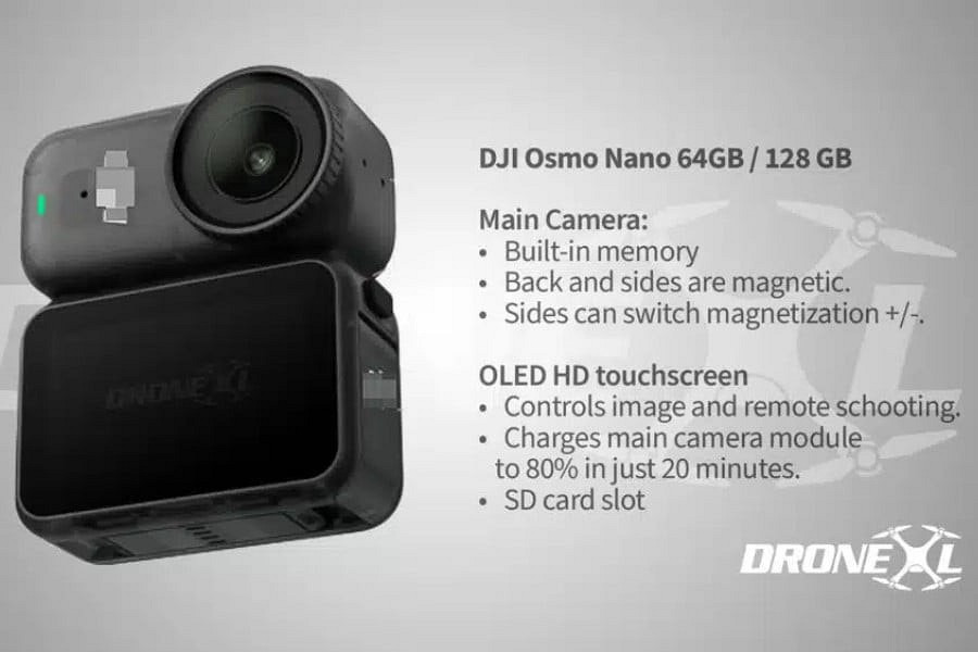 DJI Osmo Nano предложит модульную конструкцию: основная камера крепится магнитами к съемному модулю с HD OLED-дисплеем для мониторинга и управления в реальном времени. Сама камера оснащена накопителем на 64/128 ГБ и слотом для SD-карт. Заряжается девайс с 0 до 80% всего за 20 минут.
