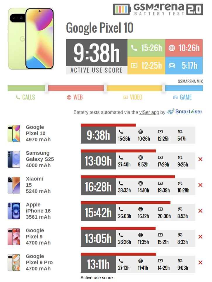 В тесте, который имитирует усредненную нагрузку, Google Pixel 10 показал результат всего в 9 часов и 38 минут. И это полный кошмар. Предшественник в лице Google Pixel 8 работал намного дольше, 13 часов и 5 минут. В чем причина? Вероятно, в процессоре Tensor G5, который система охлаждения Pixel 10 неспособна эффективно охладить.