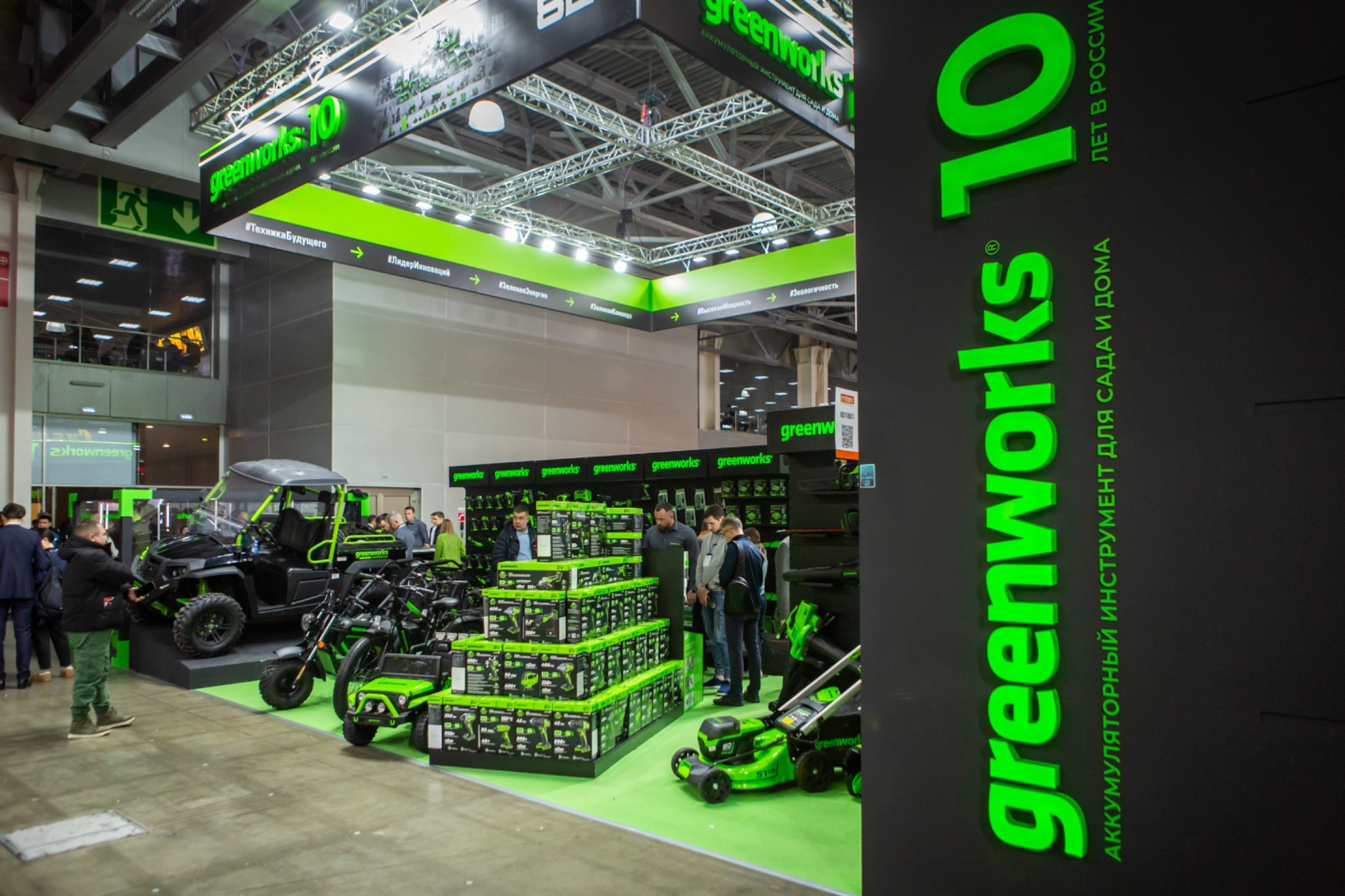 В этом году Greenworks стал генеральным спонсором выставки инструмента, оборудования и технологий MITEX, которая прошла в МВЦ «Крокус Экспо». Бренд представил на своем стенде все основные позиции разных линеек инструмента и садовой техники: любительские платформы 24V и 40V, полупрофессиональную 60V и топовую линейку 82V. Помимо уже знакомых моделей посетители выставки смогли увидеть новинки: различную двух- и четырехколесную технику, работающую от аккумуляторов.