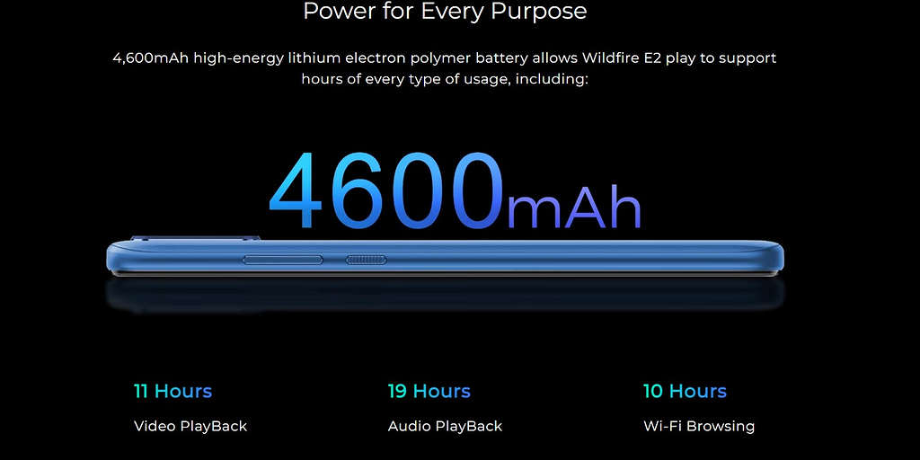 HTC Wildfire E2 Play работает под управлением операционной системы Android 12. Сканер отпечатков пальцев размещен сзади. Есть функция разблокировки по лицу. Габариты: 174,2 на 78,6 на 9,3 мм, вес — 210 г.