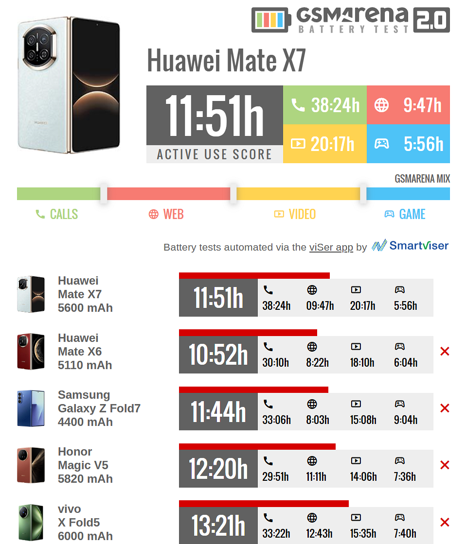 Для сравнения, предшественник в лице HUAWEI Mate X6 работал 10 часов и 52 минуты. Samsung Galaxy Z Fold7 тоже позади, у него 11 часов и 44 минуты. Что касается HONOR Magic V5, то он работает дольше, 12 часов и 20 минут. А рекордсменом является vivo X Fold5 с 13 часами и 21 минутой.