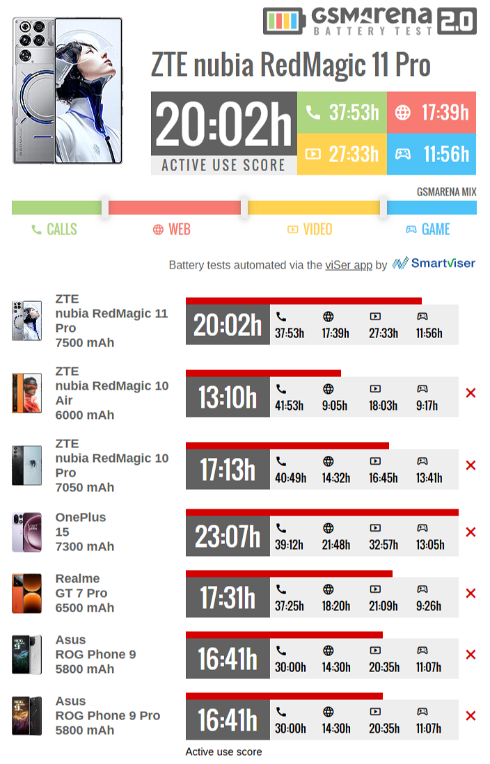 В тесте, который имитирует усредненное время использования устройства, REDMAGIC 11 Pro выдержал впечатляющие 20 часов и 2 минуты. И это один из лучших результатов для флагмана на Snapdragon 8 Elite Gen 5. Впереди только OPPO Find X9 Pro и OnePlus 15 с 21 часом 57 минутами и 23 часами 7 минутами соответственно.