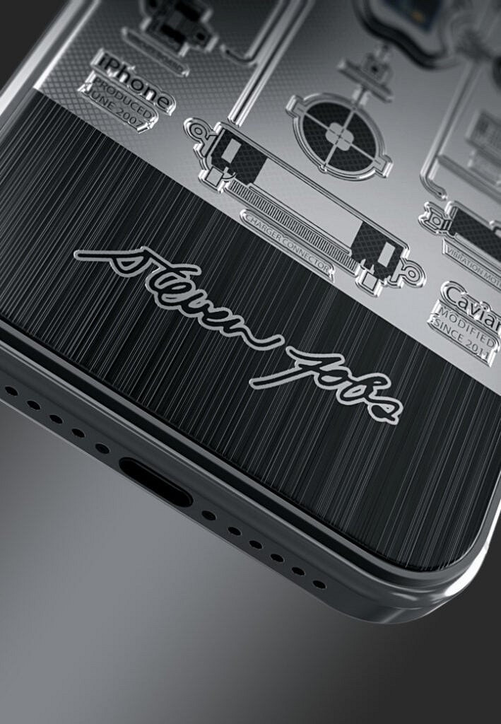Дизайн отсылает к первому iPhone: капсула с платой выполнена в форме логотипа Apple и размещена в центре задней панели, вокруг — гравировка, повторяющая схемы устройства 2007 года. Корпус сделан из титана с черным PVD-покрытием, а дополняет композицию выгравированная подпись Steve Jobs и эксклюзивная юбилейная заставка.