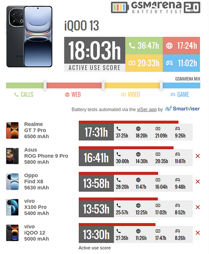 iQOO 13 признан самым долгоиграющим смартфоном на Android — тест от GSMArena