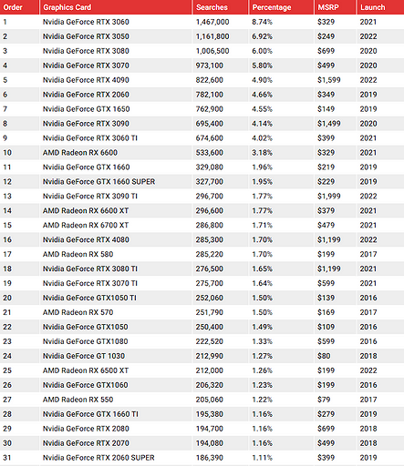 В список этот попали модели различных поколений и ценовых сегментов — в нем есть как «затычки» GT 1010/Radeon RX 550, так и флагманы линеек AMD RDNA 3 и NVIDIA Ada Lovelace. Согласно результатам исследования, самой востребованной видеокартой, которую искали больше всего, оказалась NVIDIA GeForce RTX 3060. О ней было 1 467 000 запросов, что равняется 8,74 процентам от общего объема запросов.