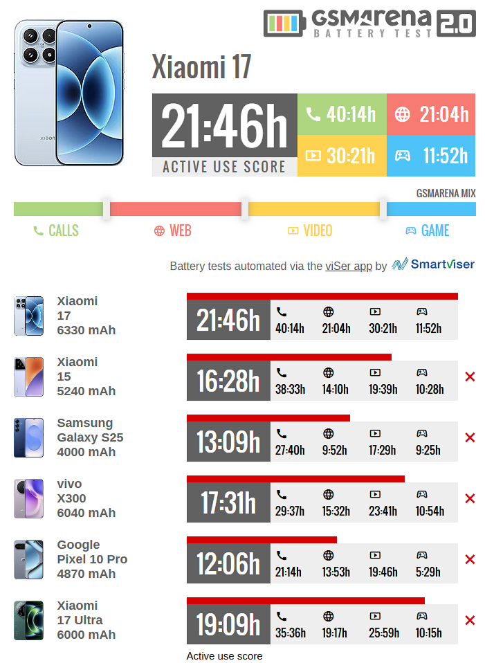 Кроме того, Xiaomi 17 работает сильно дольше, чем Xiaomi 15, у которого результат 16 часов и 28 минут. Xiaomi 17 Ultra, при этом, выдержал 19 часов и 9 минут.