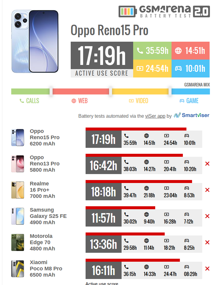 - OPPO Reno13 Pro (батарея на 5800 мА*ч) — 16 часов и 42 минуты.