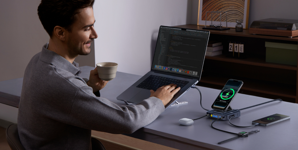 Китайский производитель аксессуаров Baseus выпустил Nomos NH21 — настольную зарядную станцию 6-в-1 для одновременной зарядки нескольких устройств.