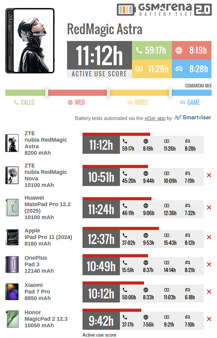 В тесте, который имитирует среднюю нагрузку, RedMagic Astra показал результат в 11 часов и 12 минут. Для планшета это вполне достойные цифры. Для сравнения, у конкурентов автономность следующая: