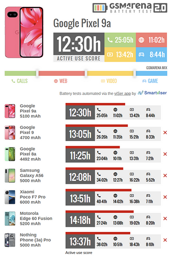 Народный Google Pixel 9a показал достойные результаты в тестах автономности от GSMArena