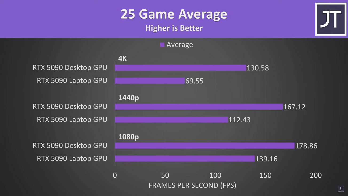В целом настольная RTX 5090 является видеокартой совершенно другого уровня. Мобильная RTX 5090 даже не способна обойти настольную RTX 5080, не говоря уже о флагманской модели.