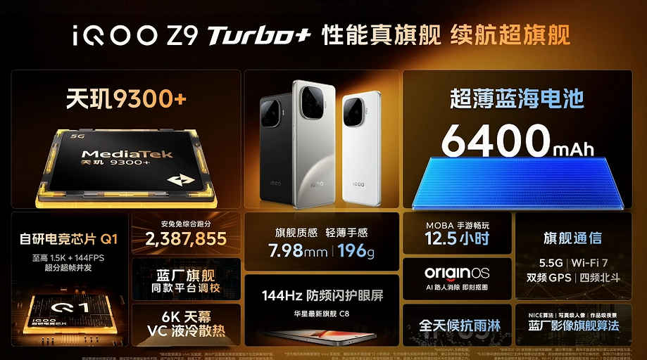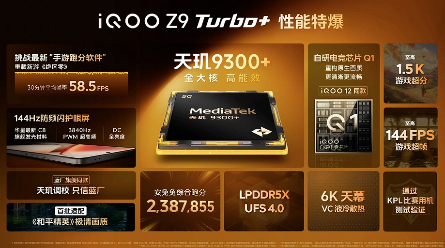 iQOO Z9 Turbo+ оснащен процессором Dimensity 9300+, который работает в паре с дополнительным чипом Q1, повышающим игровую производительность. Объем ОЗУ — от 12 до 16 ГБ, ПЗУ — от 256 до 512 ГБ. Батарея на 6400 мА*ч поддерживает быструю проводную зарядку мощностью 80 Вт.