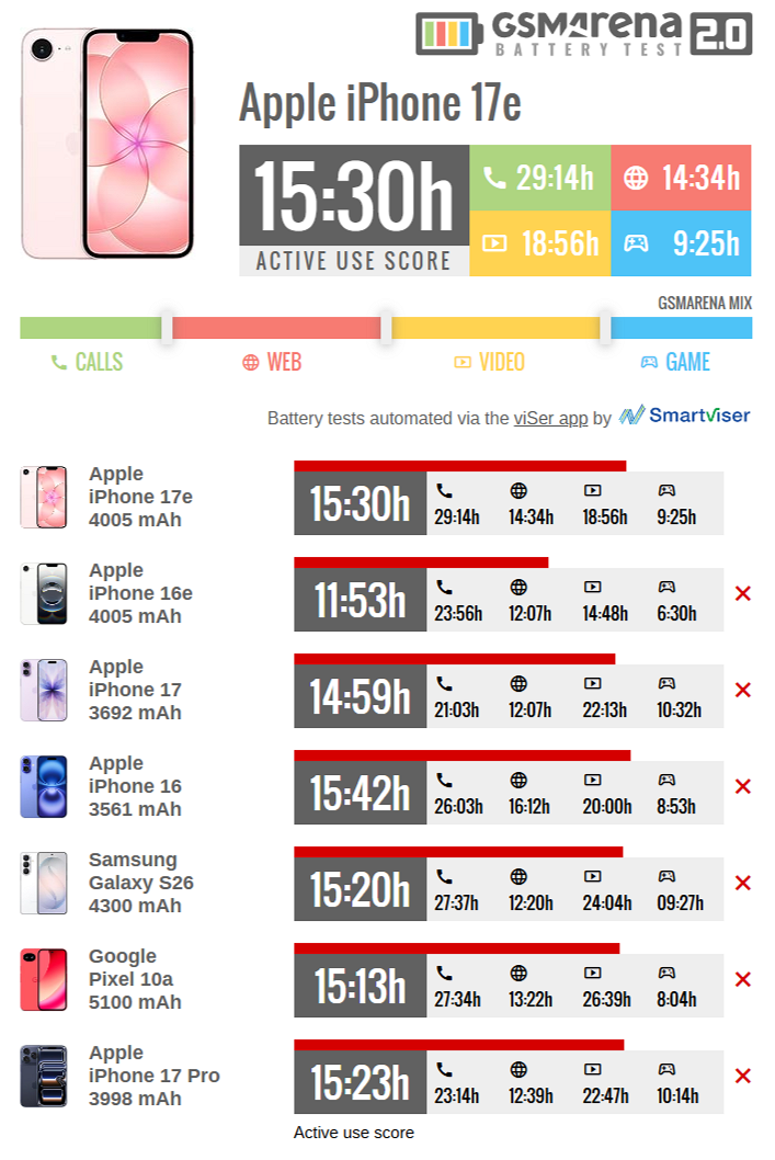 Также позади остался Samsung Galaxy S26 и Google Pixel 10a с 15 часами 20 минутами и 15 часами 13 минутами соответственно. А вот iPhone 16 работает чуть дольше, 15 часов 42 минуты.