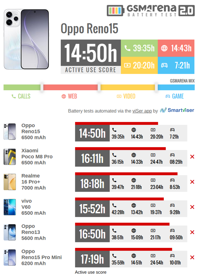 Компактный OPPO Reno15 Pro Mini с батареей на 6200 мА*ч тоже работает дольше, 17 часов и 19 минут. У POCO M8 Pro источник питания на 6500 мА*ч и время работы 16 часов и 11 минут. vivo V60 (6500 мА*ч) тоже впереди с 15 часами и 52 минутами. А лидером среди конкурентов OPPO Reno15 является realme 16 Pro+ (7000 мА*ч) с автономностью 18 часов и 18 минут.