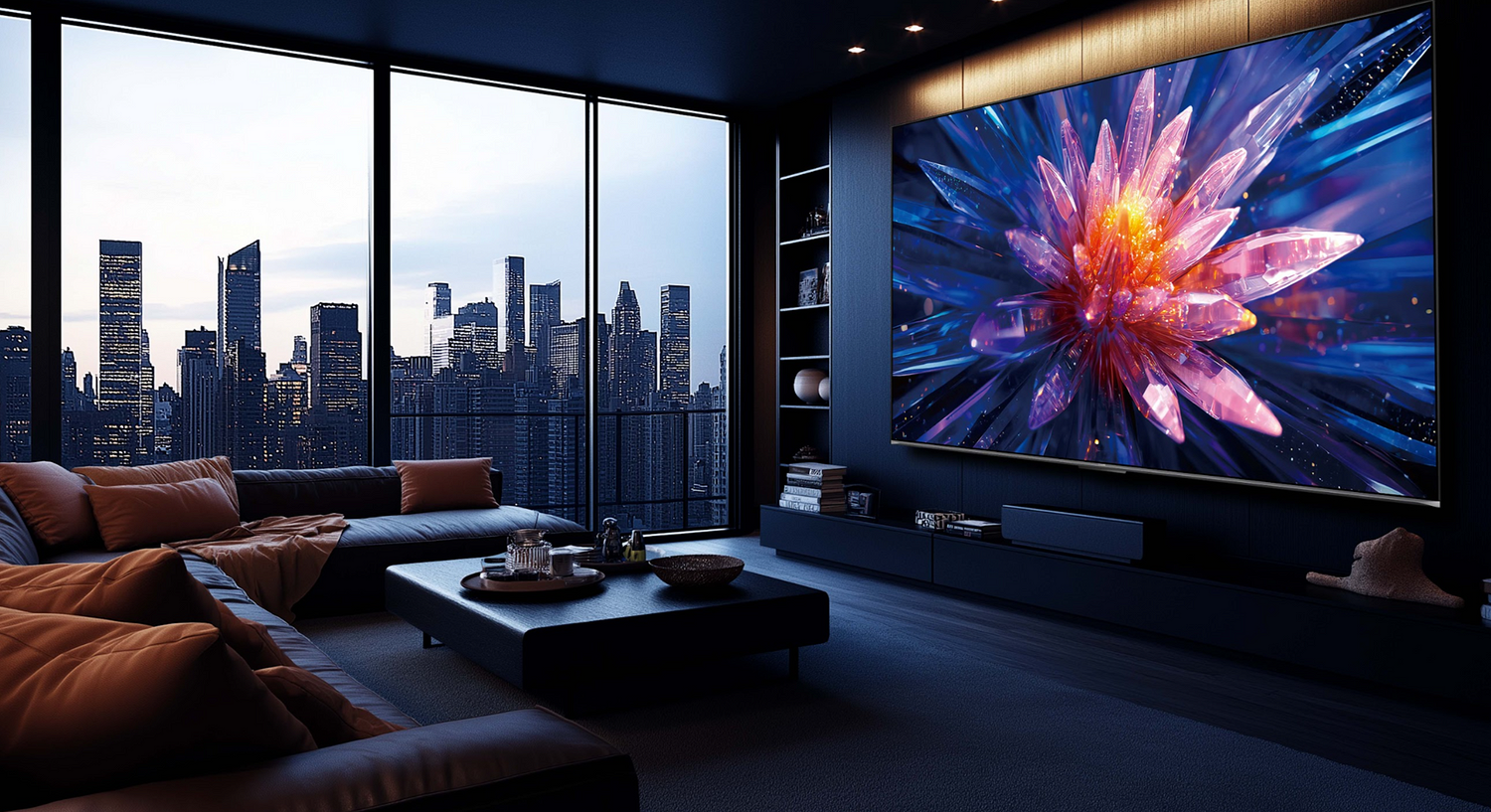 Огромный 100‑дюймовый QLED‑телевизор с плавной картинкой и мощным звуком.