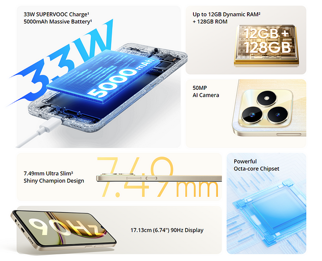 У realme C53 6,74-дюймовая IPS-панель с разрешением FHD+ и кадровой частотой 120 Гц. На экране имеется всплывающая панель по аналогии с Dynamic Island у iPhone 14 Pro/14 Pro Max. На ней отображается, например, информация о зарядке. Тыльная камера двойная, на 50 и 2 Мп. Также имеется светодиодная вспышка и селфи-камера на 8 Мп.