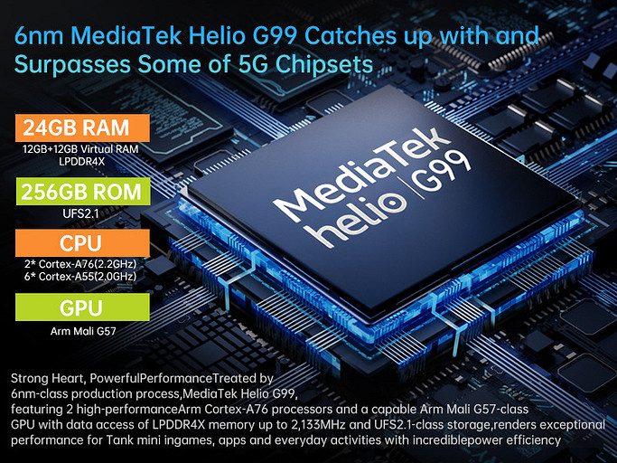Аппаратная основа Unihertz Tank Mini 1 — чип Helio G99, который работает в паре с 12 ГБ ОЗУ. Внутри накопитель на 256 ГБ. Есть слот для карты памяти microSD (до 1 ТБ). Тыльная камера одинарная, но зато 100-мегапиксельная. Селфи-камера 32-мегапиксельная. Есть мощный фонарик на 800 люмен и инфракрасный дальномер.