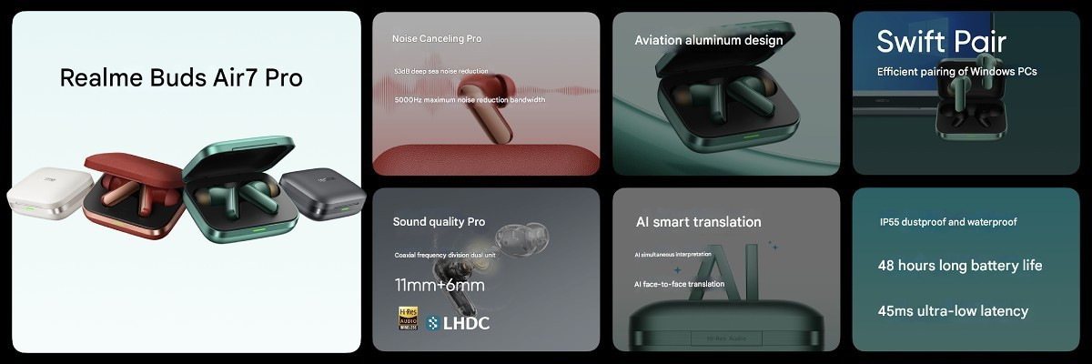 В отличие от прошлогодних Buds Air6 Pro, новинка стоит чуть дешевле — 450 юаней (~$62), но при этом предлагает более эффективное шумоподавление и увеличенное время работы. Корпус realme Buds Air7 Pro сделан из авиационного алюминия, наушники сертифицированы Hi-Res Audio Wireless и оснащены двойными коаксиальными драйверами 6 мм + 11 мм.