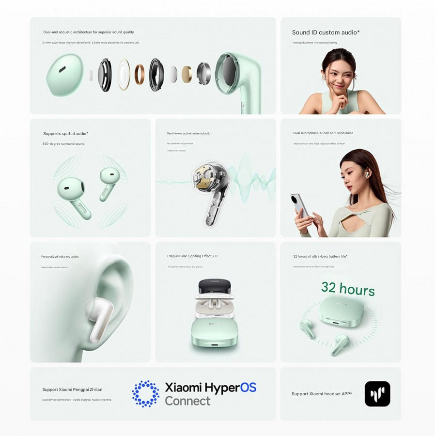 Наушники получили два динамика: основной 12,4-мм с титановым покрытием и 5,5-мм твитер с керамикой, обеспечивающие поддержку 360-градусного объёмного звука и адаптивного шумоподавления. Для этого также предусмотрено по два микрофона в каждом наушнике.