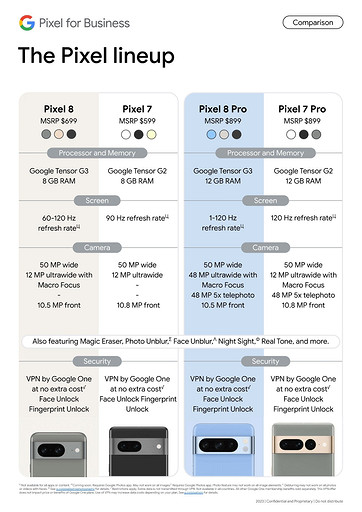 Аппаратная основа обеих моделей — чипсет Google Tensor G3 с 9 ядрами CPU. Объем оперативной памяти у Google Pixel 8 составит 8 ГБ, у Google Pixel 8 Pro — 12 ГБ. Младшая модель получит дисплей с частотой обновления 120 Гц (с возможностью работы в режиме 60 Гц), старшая — с частотой от 1 до 120 Гц.