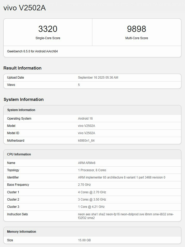 В Geekbench указано, что аппаратной основой новинки станет флагманский процессор MediaTek Dimensity 9500 (одно ядро на 4,21 ГГц, три на 3,5 ГГц и четыре на 2,7 ГГц, графика Mali-G1 Ultra MC12). Объем оперативной памяти составит 16 ГБ. Работать новинка будет под управлением актуальной операционной системы Android 16. Мощность зарядки составит 100 Вт. Емкость аккумулятора не называется, но она точно окажется больше 7000 мА*ч.