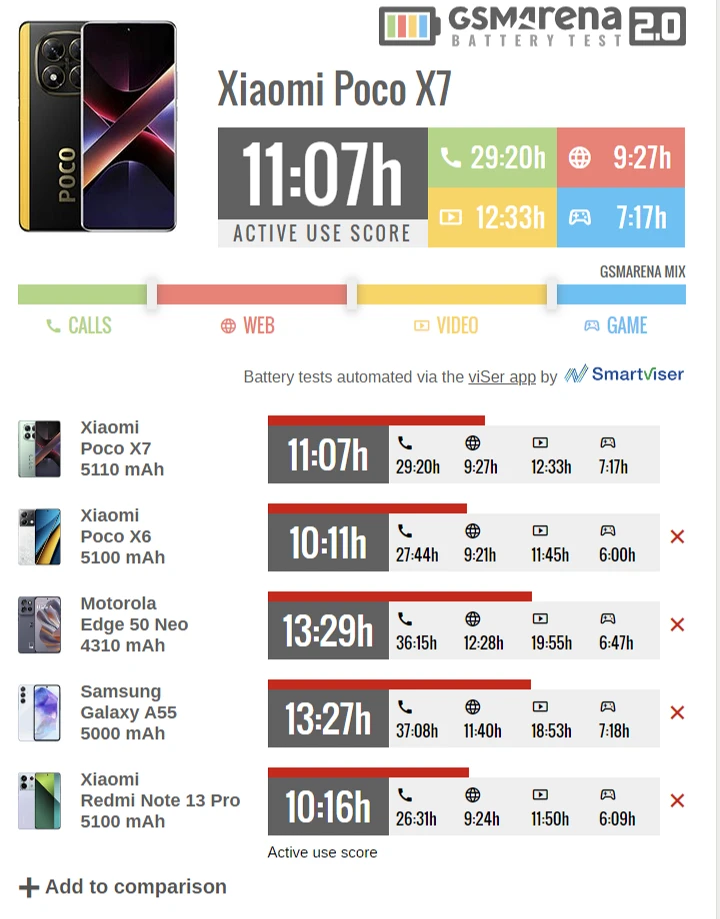 В тесте, имитирующем усредненный режим использования, POCO X7 показал результат в 11 часов и 7 минут. Да, это лучше, чем у предшественника POCO X6, который работает 10 часов и 11 минут, но сильно хуже конкурента в лице Samsung Galaxy A55.
