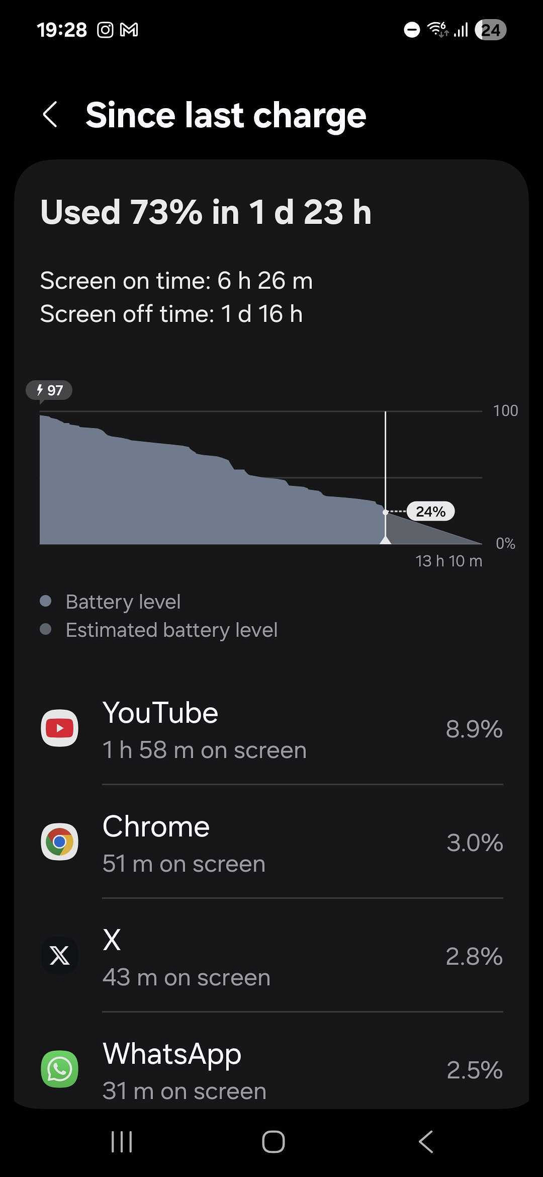 Указано, что в течение этих двух дней экран Samsung Galaxy A56 был включен 6,5 часов. Из них два часа пришлось на просмотр видео на YouTube.