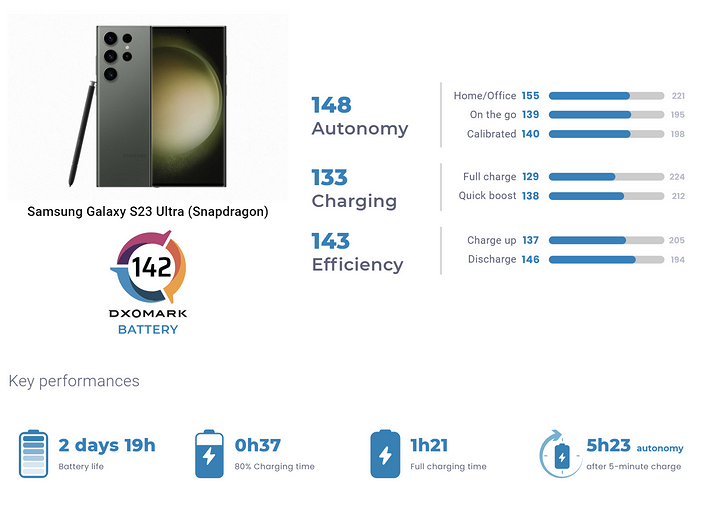 При умеренной нагрузке новинка продержалась 56 часов (Galaxy S23 Ultra — 67 часов). В режиме камеры — 4 часа 28 минут (Galaxy S23 Ultra — 4 часа 31 минуту), в режиме разговора — 31 час и 23 минут (Galaxy S23 Ultra — 29 часов 20 минут), в режиме навигатора — 8 часов 55 минут (Galaxy S23 Ultra — 10 часов 34 минуты), при использовании социальных сетей — 7 часов 45 минут (Galaxy S23 Ultra — 15 часов 3 минуты).