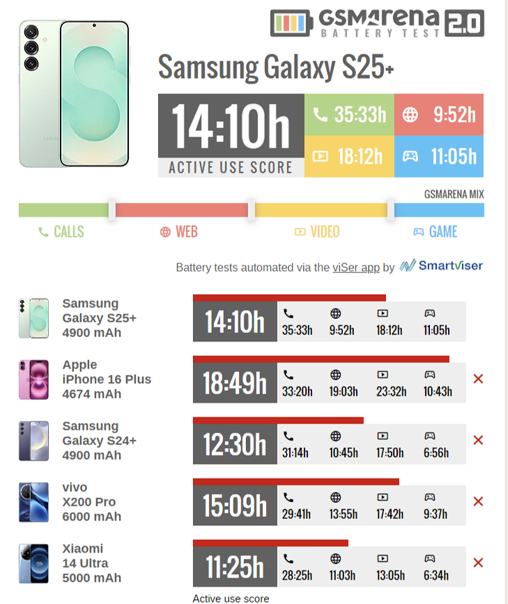 Samsung Galaxy S25+ разгромил Galaxy S24+ и Xiaomi 14 Ultra в тесте автономности