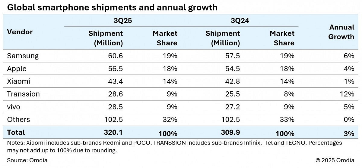 Omdia опубликовала свежий отчет по рынку смартфонов. По итогам третьего квартала 2025 года, первое место заняла компания Samsung, занявшая 19% рынка. И это на 6% больше, чем в третьем квартале прошлого года. Продажи составили 60,6 млн устройств.
