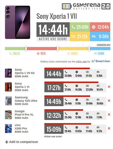 Однако Sony Xperia 1 VI с такой же батареей работает намного дольше, аж 17 часов и 27 минут. А вот разницы с Samsung Galaxy S25 Ultra у Sony Xperia 1 VII почти нет. Флагман Samsung выдержал 14 часов и 49 минут. Также дольше работает vivo X200 Pro (15 часов и 9 минут), но у него более емкий аккумулятор (6000 мА*ч). А вот Google PIxel 9 Pro XL позади с 12 часами и 32 минутами.