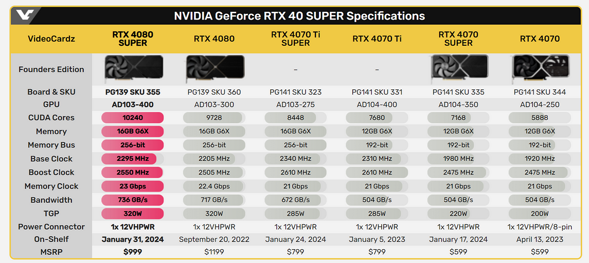 У GeForce RTX 4080 SUPER внутри графический чип AD103-400 с 10 240 ядрами CUDA, 16 ГБ видеопамяти формата GDDR6X, 256-битная шина и TDP на уровне 320 Вт. На рынке GeForce RTX 4080 SUPER заменит GeForce RTX 4080, РРЦ которой на старте, напомним, составлял $1199.