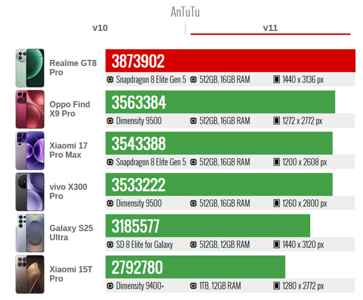 В AnTuTu у realme GT 8 Pro на базе процессора Qualcomm Snapdragon 8 Eltie Gen 5, с 16 ГБ оперативной памяти и накопителем на 512 ГБ рекордные 3 873 902 балла. Для сравнения, у OPPO Find X9 Pro с MediaTek Dimensity 9500, 16 ГБ ОЗУ и 512 ГБ ПЗУ лишь 3 563 384 балла.