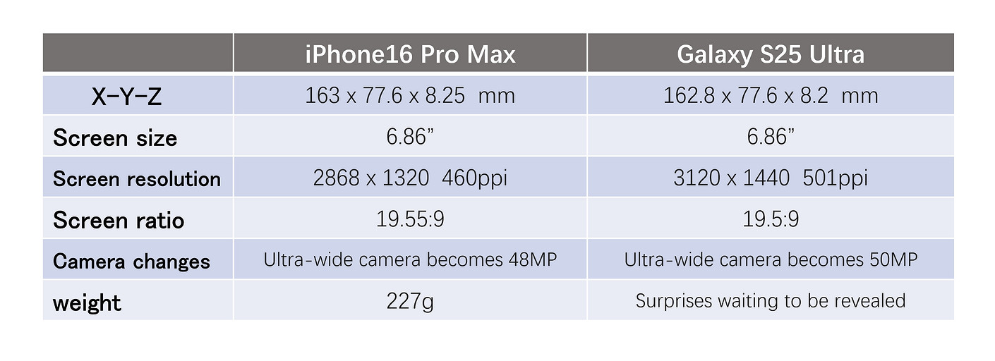 Габариты Samsung Galaxy S25 Ultra составят 162,8 на 77,6 на 8,2 мм. У iPhone 16 Pro Max — 163 на 77,6 на 8,25 мм. При этом экраны смартфонов одинаковые, 6,86-дюймовые. Разрешение у Samsung'а выше, 3120 на 1440 пикселей. У iPhone 16 Pro Max лишь 2868 на 1320 пикселей.